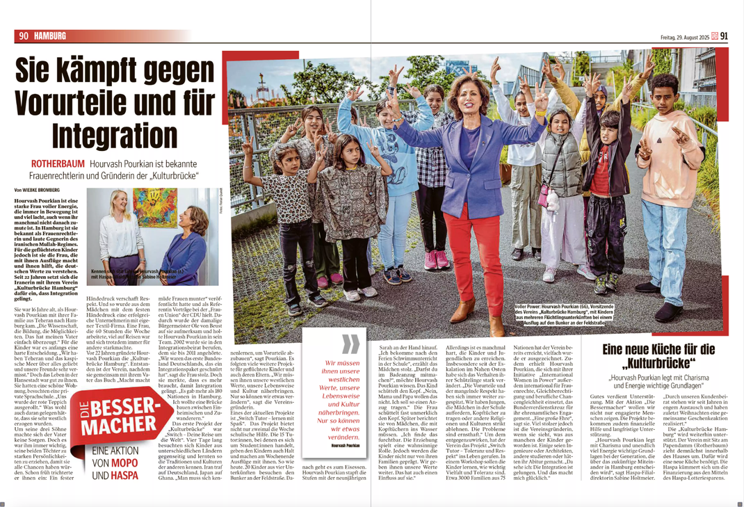 In der Asugabe vom 29.08.2025 hat die Hamburger Morgenpost Hourvash Pourkian porträtiert. In dem Artikel spricht Hourvash über ihr gesellschaftliches Engagement, stellt die Projekte der Kulturbrücke vor und berichtet von den aktuellen Herausforderungen.